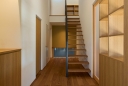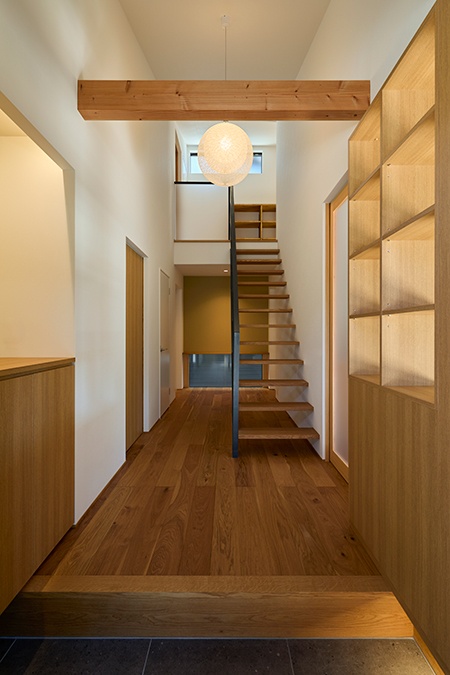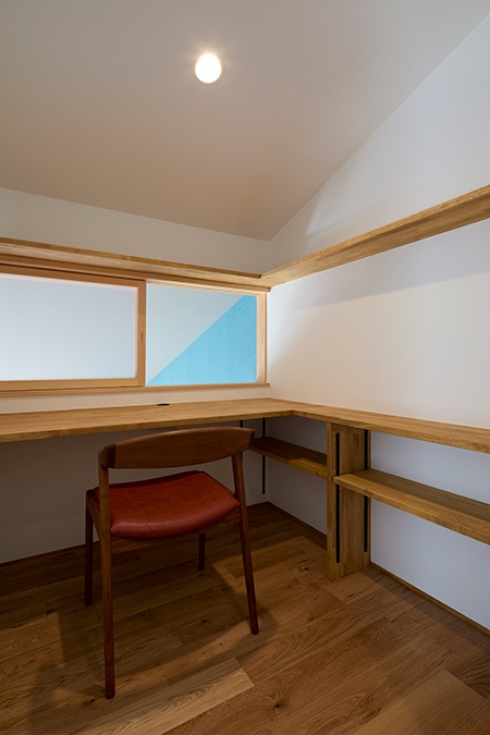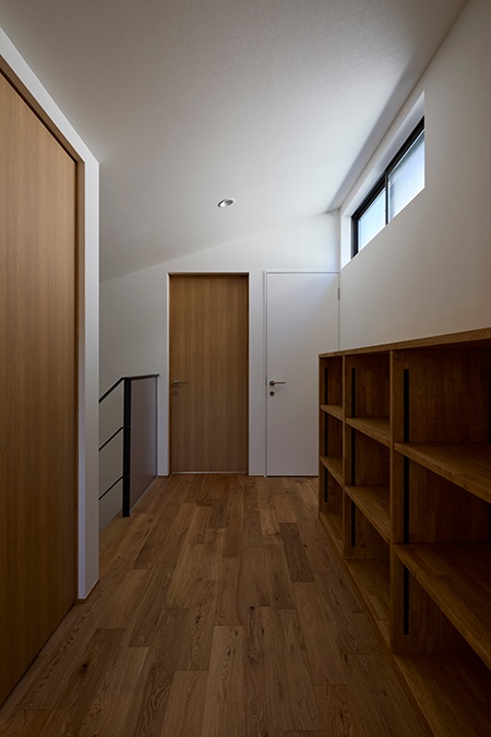 敷地は閑静な住宅街に位置し日当たりも良いものの、高低差があるため道路からの視線が気になってしまう。そこで周辺環境から一度切り離すための塀を設け、その内側に庭を確保した。窓からはその庭を楽しめるように配慮している。 2階には子供室のみを配置し、LDK・寝室・水回りを1階にまとめることで、夫婦は将来を見据えて平屋のような生活ができる計画とした。上下階のバランスを取りながら吹き抜けを設けることで、1階と2階を緩やかにつなぎ、家族同士の距離感を適度に保つことができている。さらに、ソファーコーナーや2階の図書コーナー、書斎など小さな居場所を散りばめることで、家族それぞれが自分の居場所を持ちながら、ひとつの大きな屋根の下で共に過ごしていける豊かな家になったと思う。