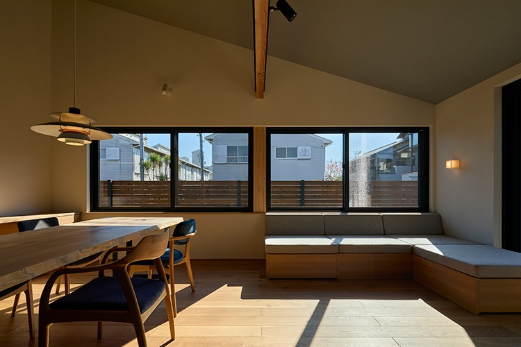 敷地は閑静な住宅街に位置し日当たりも良いものの、高低差があるため道路からの視線が気になってしまう。そこで周辺環境から一度切り離すための塀を設け、その内側に庭を確保した。窓からはその庭を楽しめるように配慮している。